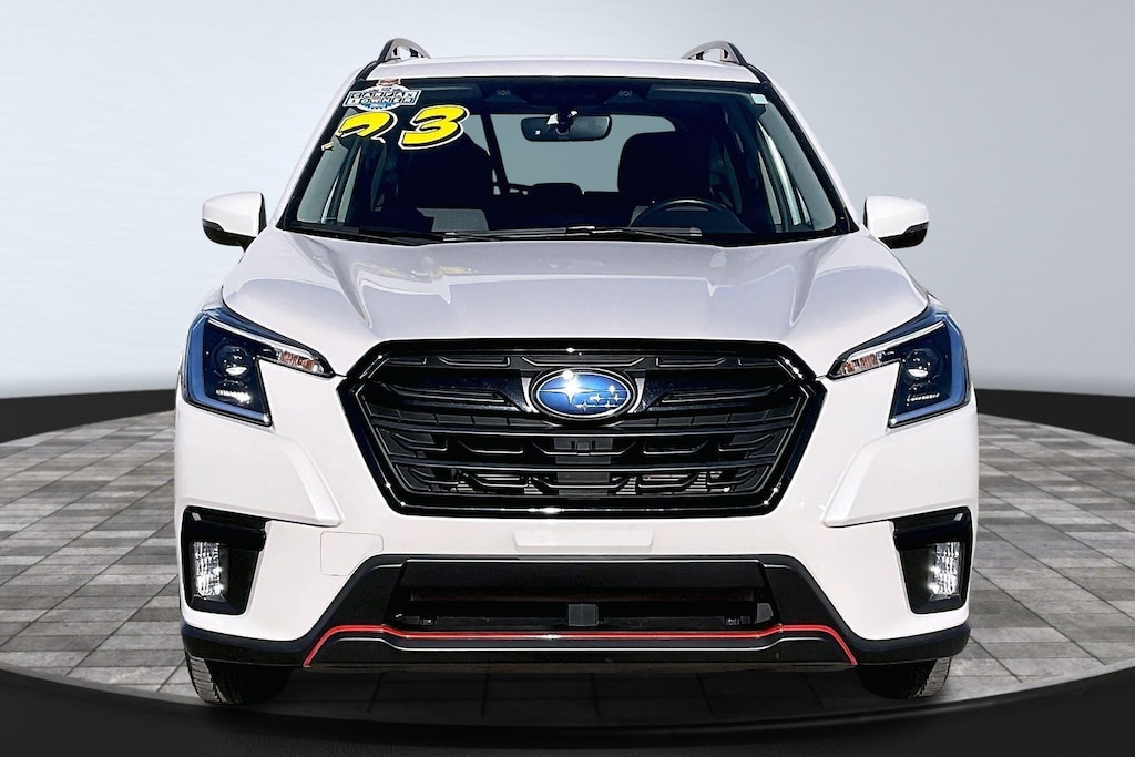 Priced below KBB Fair Purchase Price! 2023 Subaru Certified. White AWD Forester Sport Lineartronic CVT 3.70 Axle Ratio, 4-Wheel Disc Brakes, 6 Speakers, ABS brakes, Air Conditioning, Alloy wheels, AM/FM radio: SiriusXM, Anti-whiplash front head restraints, Auto High-beam Headlights, Automatic temperature control, Brake assist, Bumpers: body-color, CD player, Driver door bin, Driver vanity mirror, Dual front impact airbags, Dual front side impact airbags, Electronic Stability Control, Emergency communication system: STARLINK Safety and Security (Subscription Required), Exterior Parking Camera Rear, Four wheel independent suspension, Front anti-roll bar, Front Bucket Seats, Front Center Armrest, Front fog lights, Front reading lights, Fully automatic headlights, Heated door mirrors, Heated Front Bucket Seats, Heated front seats, Illuminated entry, Knee airbag, Leather Shift Knob, Low tire pressure warning, Occupant sensing airbag, Outside temperature display, Overhead airbag, Overhead console, Panic alarm, Passenger door bin, Passenger vanity mirror, Power door mirrors, Power driver seat, Power moonroof: Panoramic, Power steering, Power windows, Radio data system, Radio: Subaru Starlink 6.5" Multimedia Plus System, Rear anti-roll bar, Rear seat center armrest, Rear window defroster, Rear window wiper, Remote keyless entry, Roof rack: rails only, Security system, Speed control, Speed-sensing steering, Split folding rear seat, Spoiler, Sport Cloth Upholstery, STARLINK/Apple CarPlay/Android Auto, Steering wheel mounted audio controls, Tachometer, Telescoping steering wheel, Tilt steering wheel, Traction control, Trip computer, Turn signal indicator mirrors, Variably intermittent wipers, and Wheels: 18" x 7.0 J Black Finish Aluminum-Alloy.