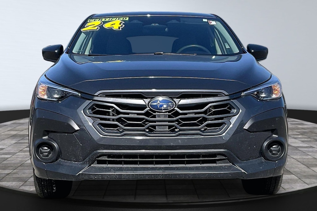 2024 Subaru Certified. Magnetite Gray Metallic AWD Crosstrek Lineartronic CVT 3.90 Axle Ratio, 4 Speakers, 4-Wheel Disc Brakes, ABS brakes, Air Conditioning, Alloy wheels, AM/FM radio: SiriusXM, Anti-whiplash front head restraints, Auto High-beam Headlights, Automatic temperature control, Brake assist, Bumpers: body-color, Cloth Upholstery, Driver door bin, Driver vanity mirror, Dual front impact airbags, Dual front side impact airbags, Electronic Stability Control, Exterior Parking Camera Rear, Four wheel independent suspension, Front anti-roll bar, Front Bucket Seats, Front Center Armrest, Front dual zone A/C, Front reading lights, Fully automatic headlights, Illuminated entry, Knee airbag, Low tire pressure warning, Occupant sensing airbag, Outside temperature display, Overhead airbag, Overhead console, Panic alarm, Passenger door bin, Passenger vanity mirror, Power door mirrors, Power steering, Power windows, Radio data system, Radio: Subaru STARLINK Dual 7.0" Multimedia System, Rear anti-roll bar, Rear window defroster, Rear window wiper, Remote keyless entry, Security system, Speed control, Speed-sensing steering, Split folding rear seat, Spoiler, STARLINK/Apple CarPlay/Android Auto, Steering wheel mounted audio controls, Tachometer, Telescoping steering wheel, Tilt steering wheel, Traction control, Trip computer, Variably intermittent wipers, and Wheels: 17" x 7.0J Dark Gray Aluminum Alloy.