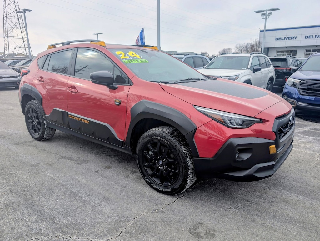 2024 Subaru Certified. Lithium Red Pearl AWD Crosstrek Wilderness Lineartronic CVT Odometer is 8185 miles below market average! Crosstrek Mirror Package (Auto-Dimming Exterior Mirror w/Approach Light and Auto-Dimming Mirror w/Compass & HomeLink), harman/kardon Aud & Pwr Moonroof & Pwr Driver Seat (10-Way Power Driver's Seat, harman/kardon Surround Sound Speaker System, and Power Moonroof), 4-Wheel Disc Brakes, 4.11 Axle Ratio, 6 Speakers, ABS brakes, Air Conditioning, Alloy wheels, AM/FM radio: SiriusXM, Anti-whiplash front head restraints, Auto High-beam Headlights, Automatic temperature control, Brake assist, Bumpers: body-color, Driver door bin, Driver vanity mirror, Dual front impact airbags, Dual front side impact airbags, Electronic Stability Control, Emergency communication system: STARLINK Safety and Security (Subscription Required), Exterior Parking Camera Rear, Four wheel independent suspension, Front anti-roll bar, Front Bucket Seats, Front Center Armrest, Front dual zone A/C, Front fog lights, Front reading lights, Fully automatic headlights, Heated door mirrors, Heated Front Bucket Seats, Heated front seats, Illuminated entry, Knee airbag, Leather Shift Knob, LED Upgrade, Low tire pressure warning, Occupant sensing airbag, Outside temperature display, Overhead airbag, Overhead console, Panic alarm, Passenger door bin, Passenger vanity mirror, Power door mirrors, Power steering, Power windows, Radio data system, Radio: Subaru STARLINK 11.6" Multimedia Plus Sys, Rear anti-roll bar, Rear seat center armrest, Rear window defroster, Rear window wiper, Remote keyless entry, Security system, Speed control, Speed-sensing steering, Split folding rear seat, Spoiler, STARLINK/Apple CarPlay/Android Auto, Steering wheel mounted audio controls, Tachometer, Telescoping steering wheel, Tilt steering wheel, Traction control, Trip computer, Turn signal indicator mirrors, Variably intermittent wipers, Wheels: 17" x 7.0J Matte Black Aluminum Alloy, and Wilderness StarTex Upholstery.