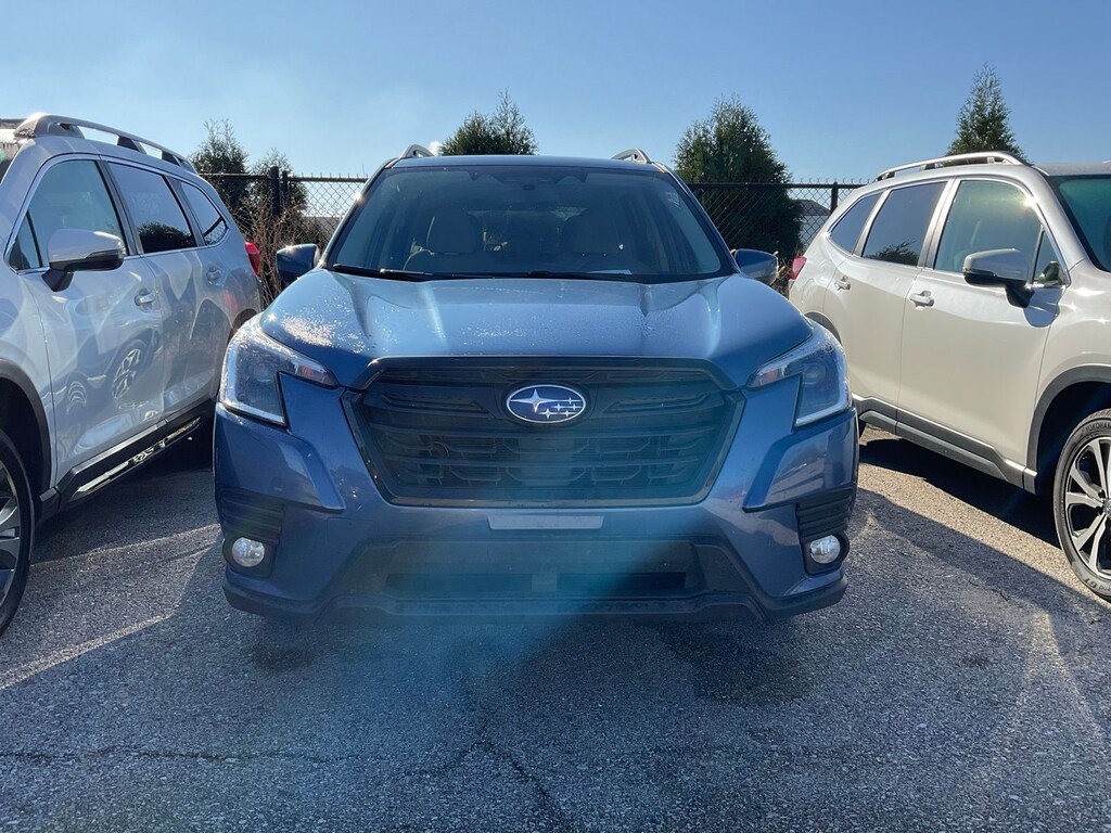 2023 Subaru Certified. Horizon Blue Pearl AWD Forester Premium Lineartronic CVT Odometer is 25456 miles below market average! Blind Spot Detection w/RCTA & Power Rear Gate (Blind-Spot Detection (BSD), Driver's Seatback Divided Pocket, Dual USB Charge Ports, EyeSight System, Multi-Function High Grade Display, and Power Rear Gate), 3.70 Axle Ratio, 4-Wheel Disc Brakes, 6 Speakers, ABS brakes, Air Conditioning, All-Weather Floor Liners, Alloy wheels, AM/FM radio: SiriusXM, Anti-whiplash front head restraints, Auto High-beam Headlights, Automatic temperature control, Brake assist, Bumpers: body-color, Cargo Net, CD player, Driver door bin, Driver vanity mirror, Dual front impact airbags, Dual front side impact airbags, Electronic Stability Control, Emergency communication system: STARLINK Safety and Security (Subscription Required), Exterior Parking Camera Rear, Four wheel independent suspension, Front anti-roll bar, Front Bucket Seats, Front Center Armrest, Front fog lights, Front reading lights, Fully automatic headlights, Heated door mirrors, Heated Front Bucket Seats, Heated front seats, Illuminated entry, Knee airbag, Low tire pressure warning, Occupant sensing airbag, Outside temperature display, Overhead airbag, Overhead console, Panic alarm, Passenger door bin, Passenger vanity mirror, Power door mirrors, Power driver seat, Power moonroof: Panoramic, Power steering, Power windows, Premium Cloth Upholstery, Radio data system, Radio: Subaru Starlink 6.5" Multimedia Plus System, Rear anti-roll bar, Rear seat center armrest, Rear window defroster, Rear window wiper, Remote keyless entry, Roof rack: rails only, Security system, Speed control, Speed-sensing steering, Splash Guards, Split folding rear seat, Spoiler, STARLINK/Apple CarPlay/Android Auto, Steering wheel mounted audio controls, Tachometer, Telescoping steering wheel, Tilt steering wheel, Traction control, Trip computer, Variably intermittent wipers, and Wheels: 17" x 7.0 J Black Machine Finish Alloy.